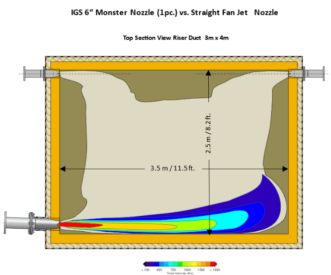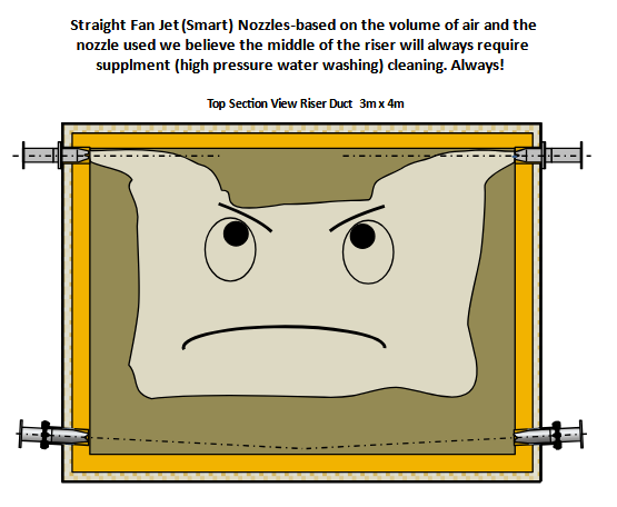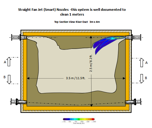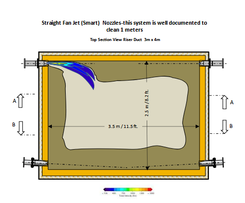 This only cleans buildup within 3 feet of the air cannon and allows accumulation in the middle of the riser duct. The CFD modeling below shows the deficiency: